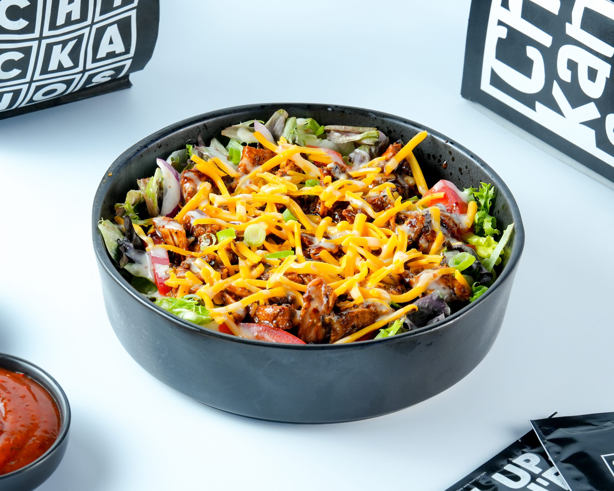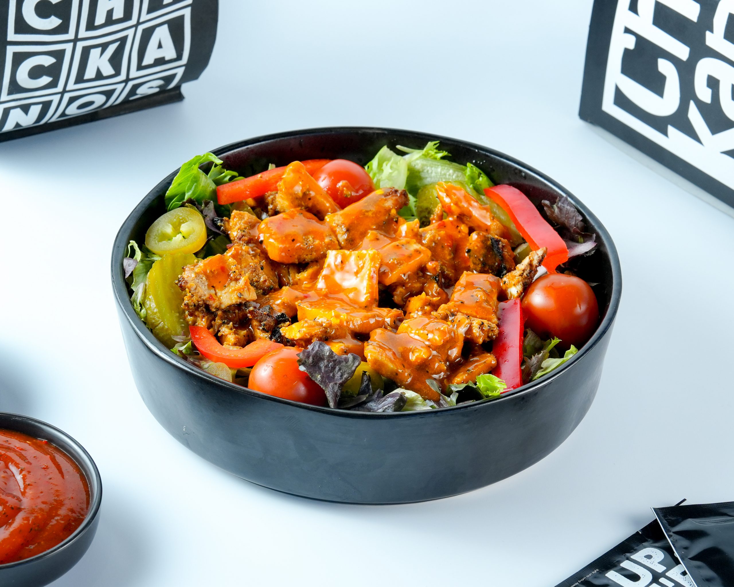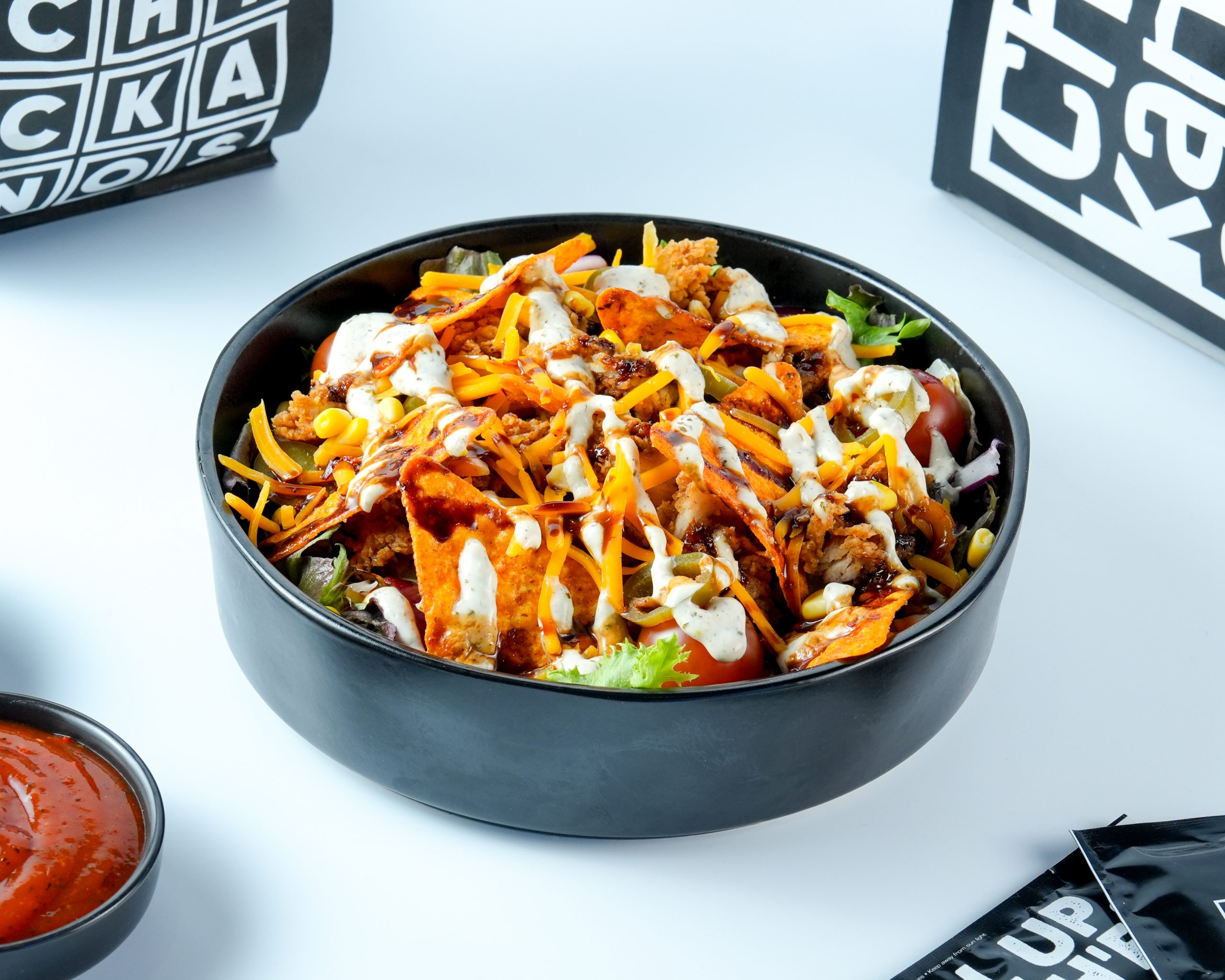 Lettuce, Rocket Salad, Red Onions, Cherry Tomatoes, Jalapenos, Sweetcorn, Cheese, Nachos, Fried Chicken and Tex Mex dressing