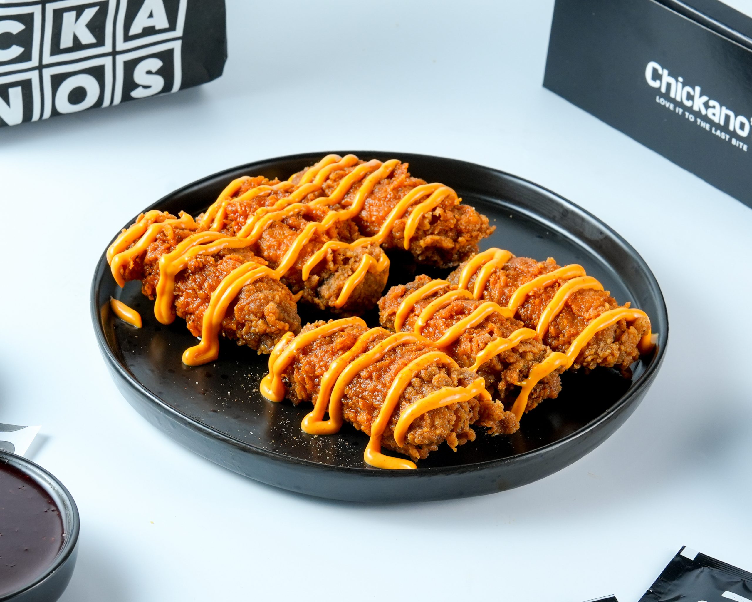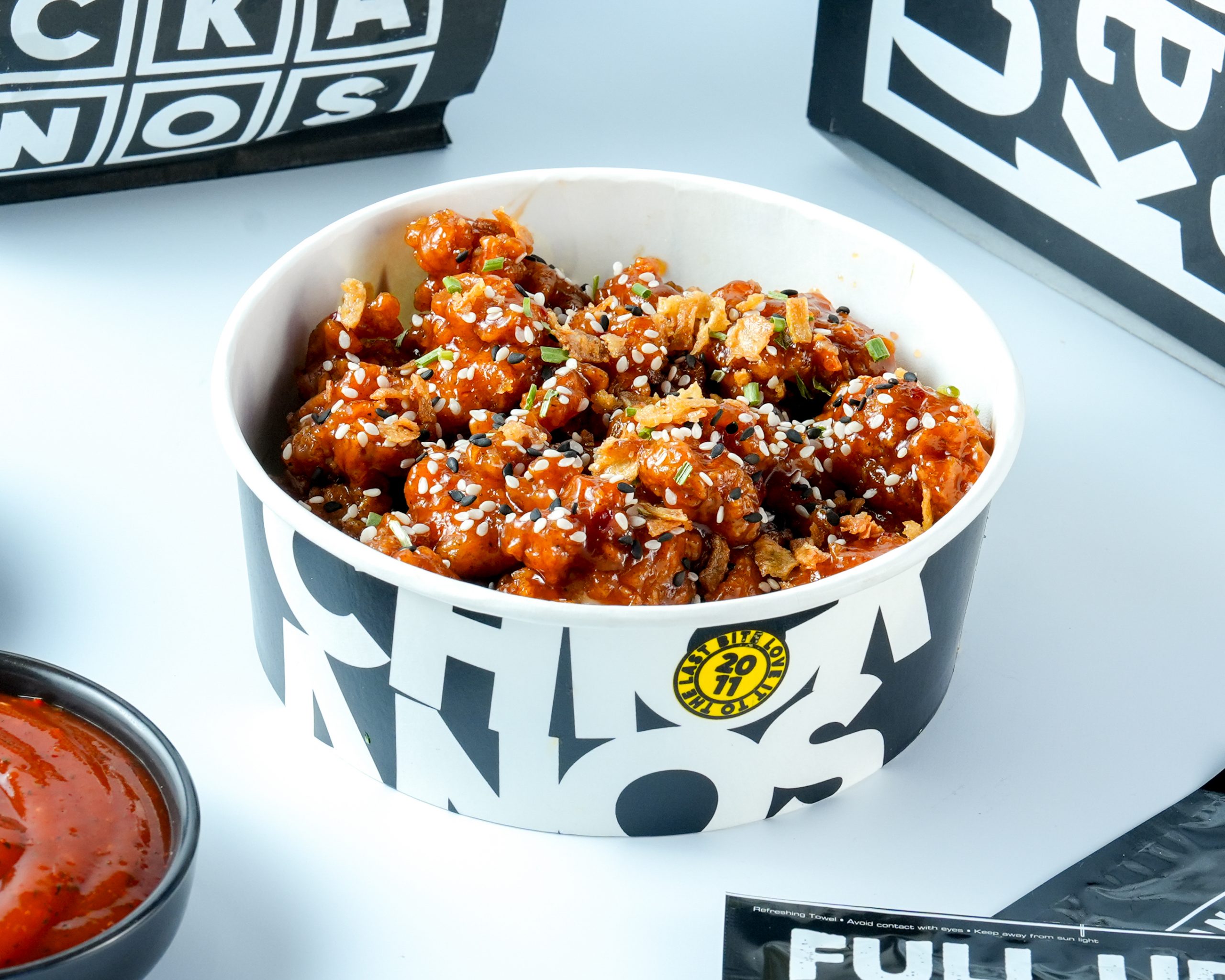 Boneless Bites with Honey Chilli Sauce, Sesame Seeds, Chives and Fried Onions