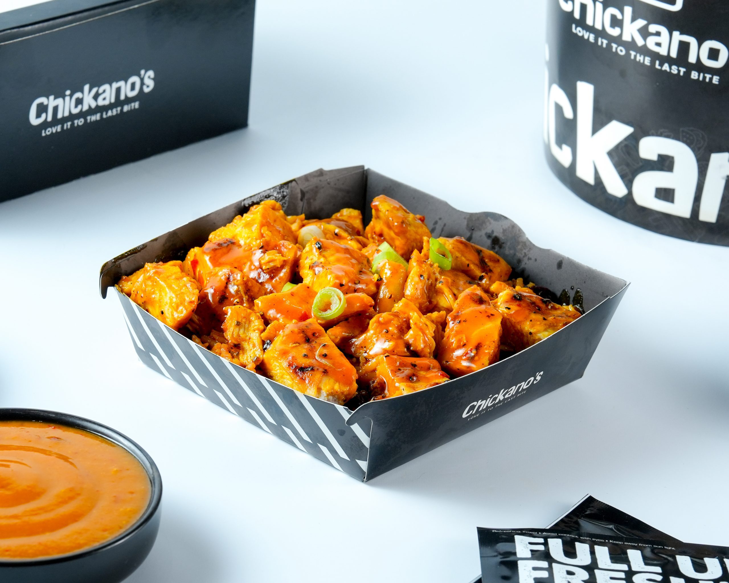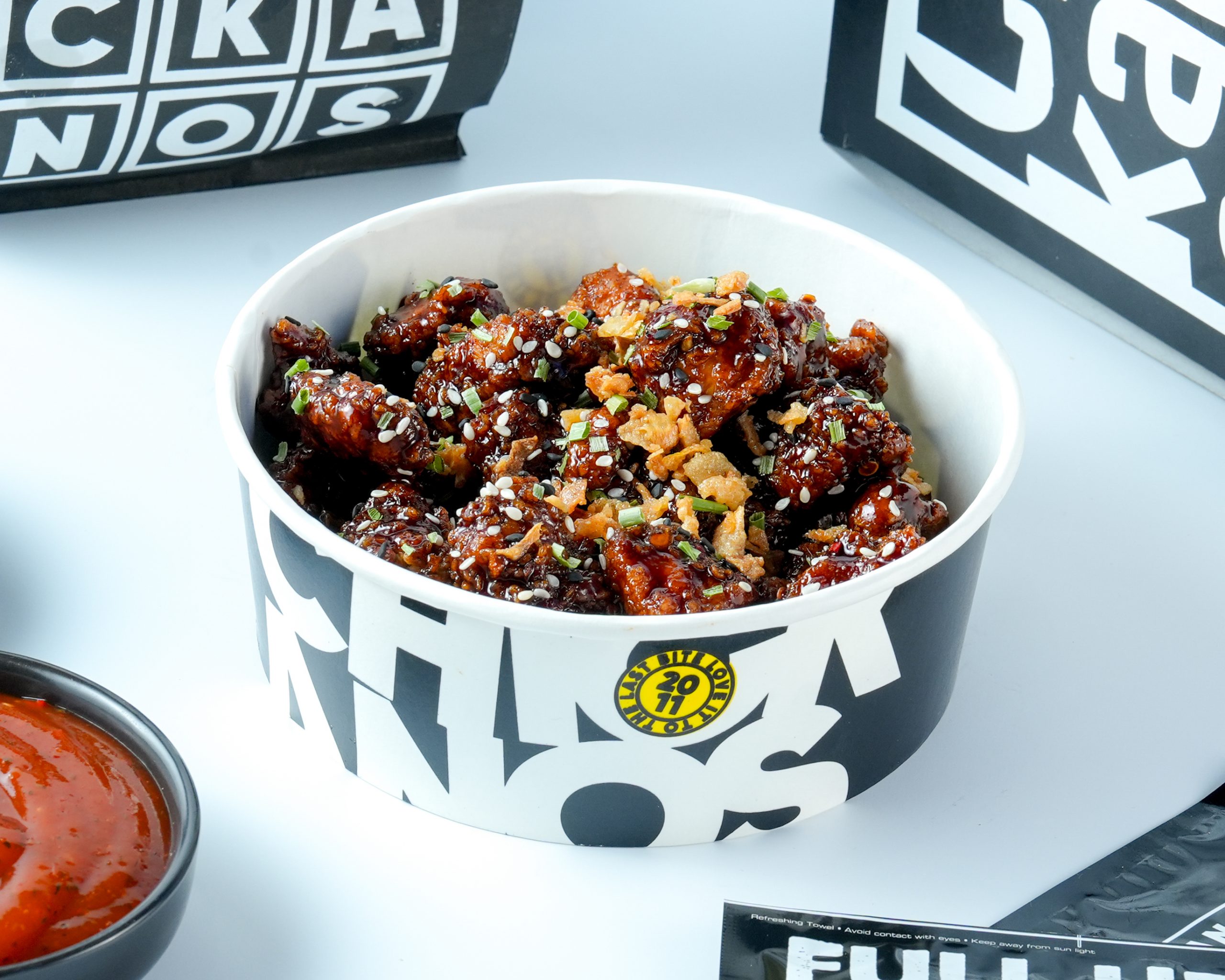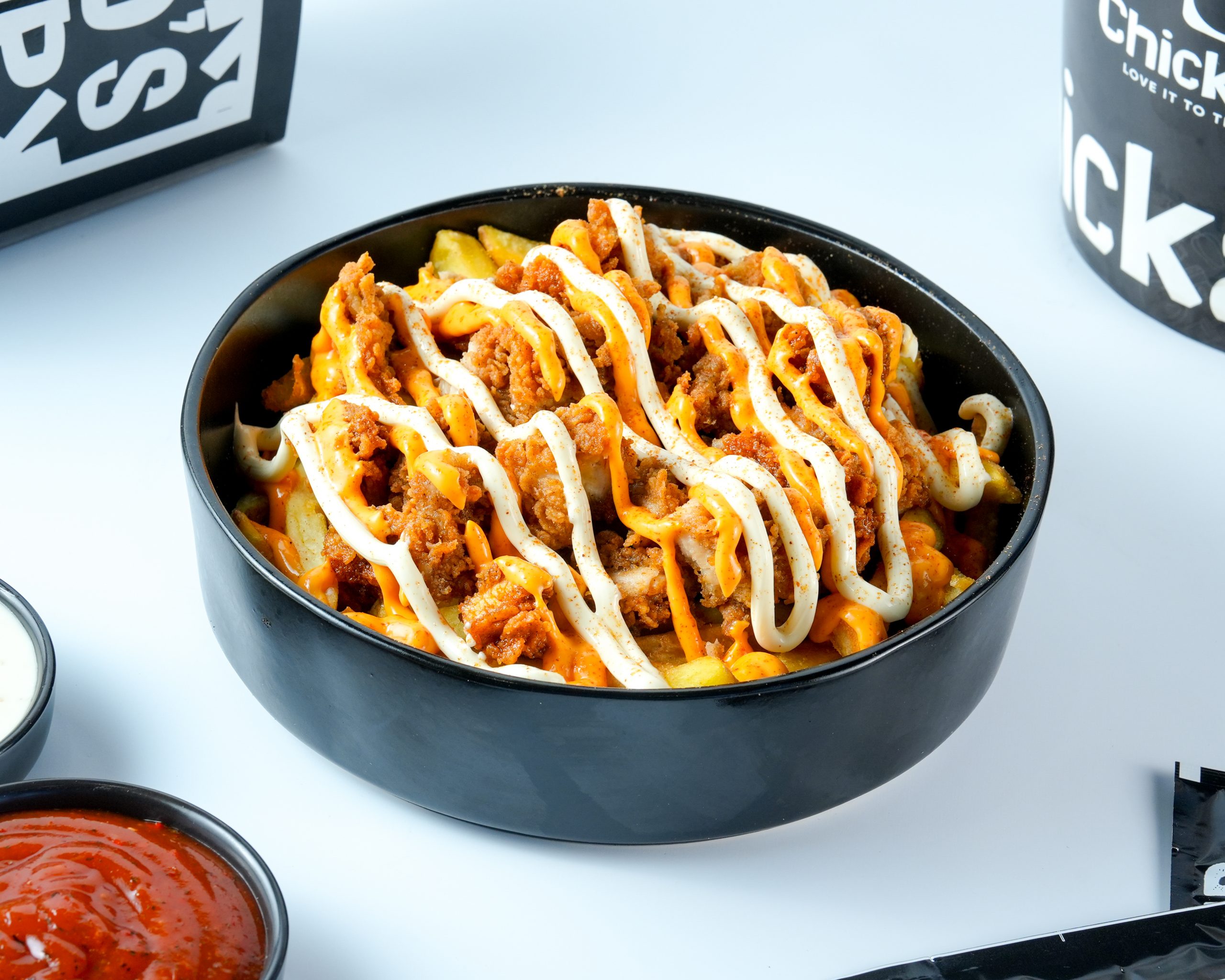 Crispy Fries, Honey Chilli Chicken Bites, Sesame Seeds, Chives, Fried Onions, Stinger Sauce