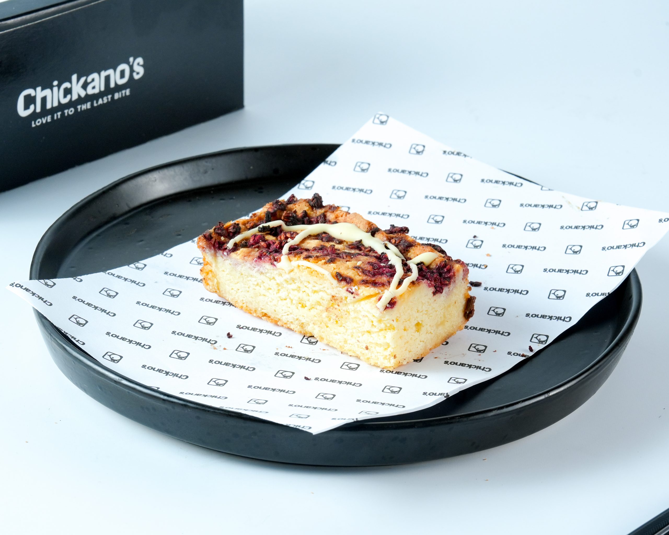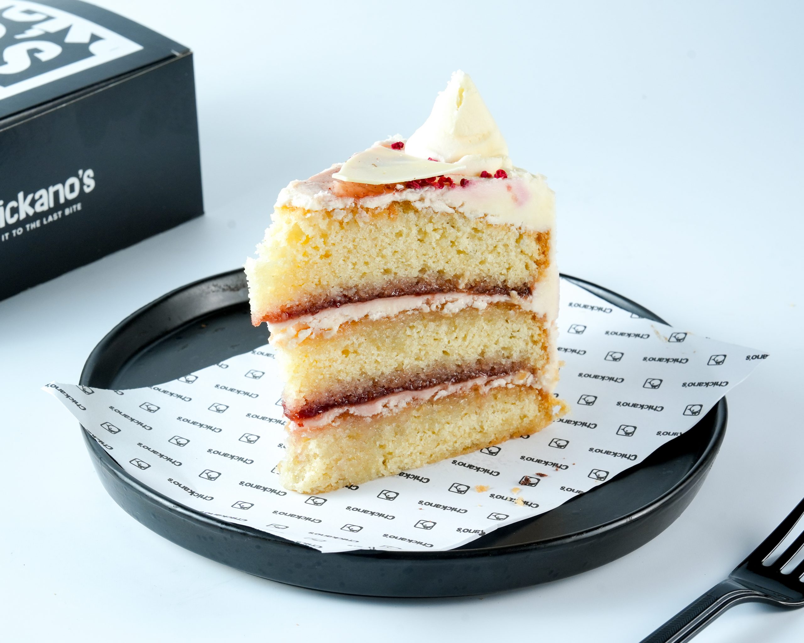 Triple layer vanilla sponge, layered with Raspberry jam and a vanilla buttercream coating. Topped with white chocolate and dried Raspberry crumb.