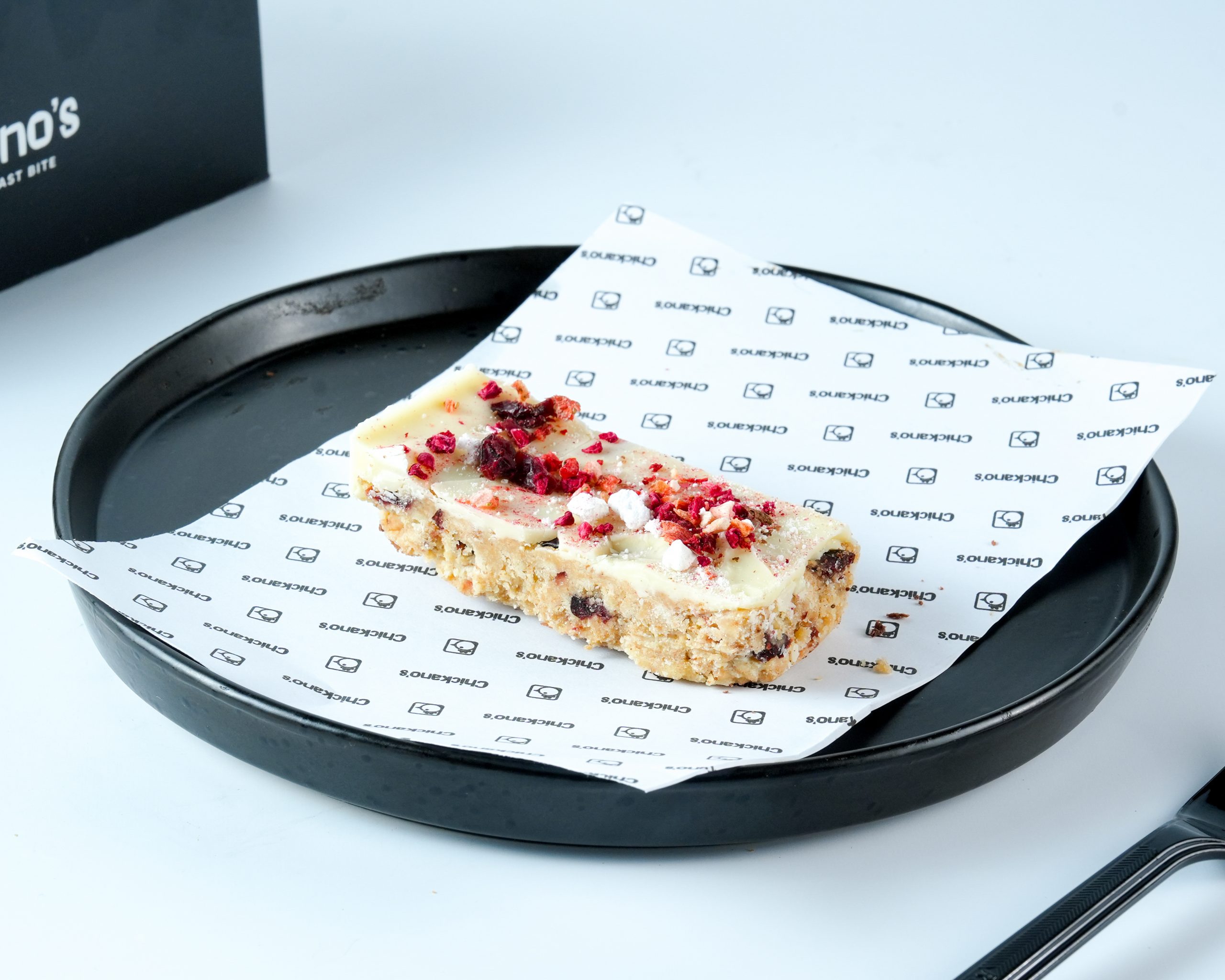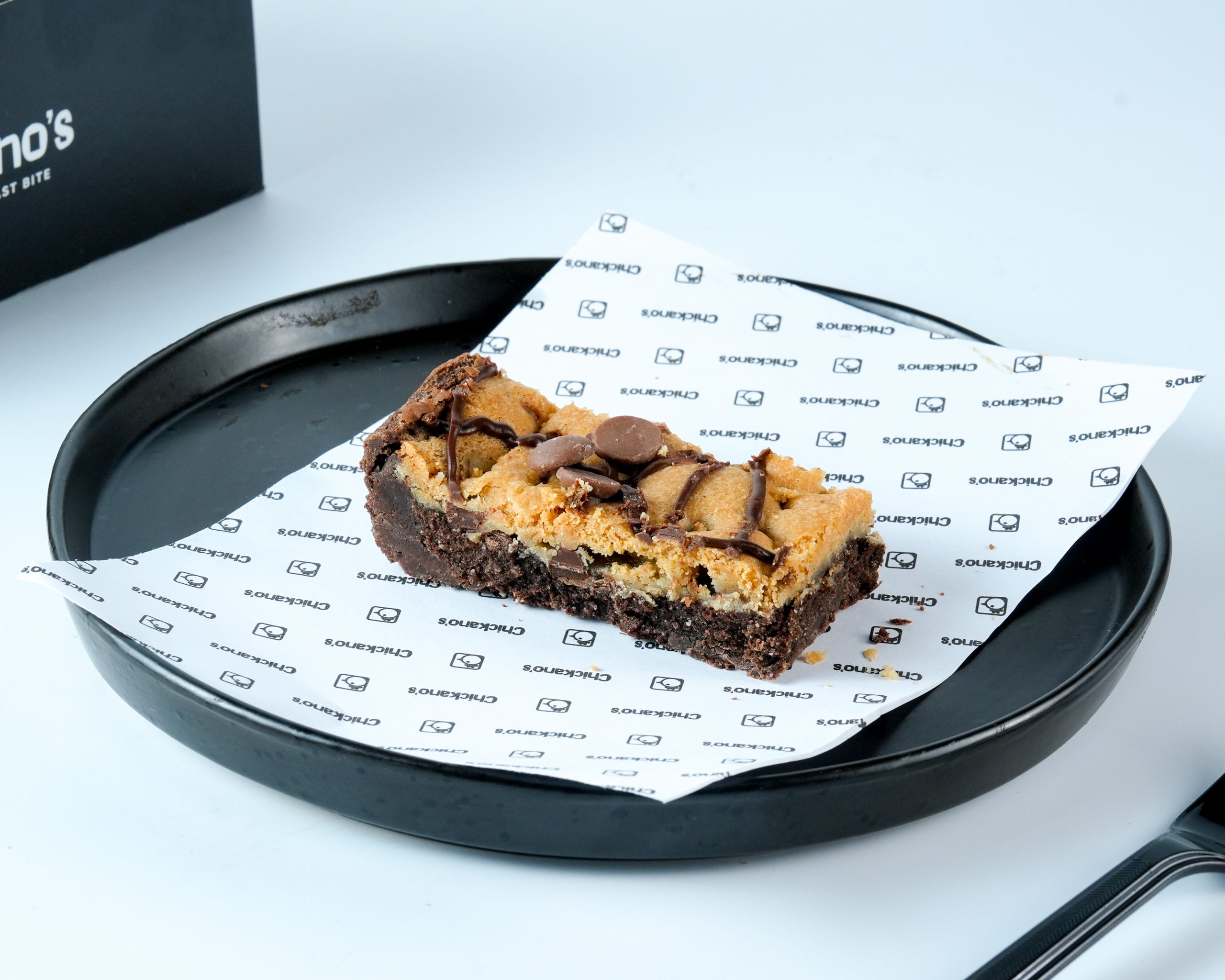 Brownie base stacked with a layer of baked chocolate chip cookie dough drizzled with dark chocolate ganache. Finished with a sprinkle of milk & white chocolate chips.