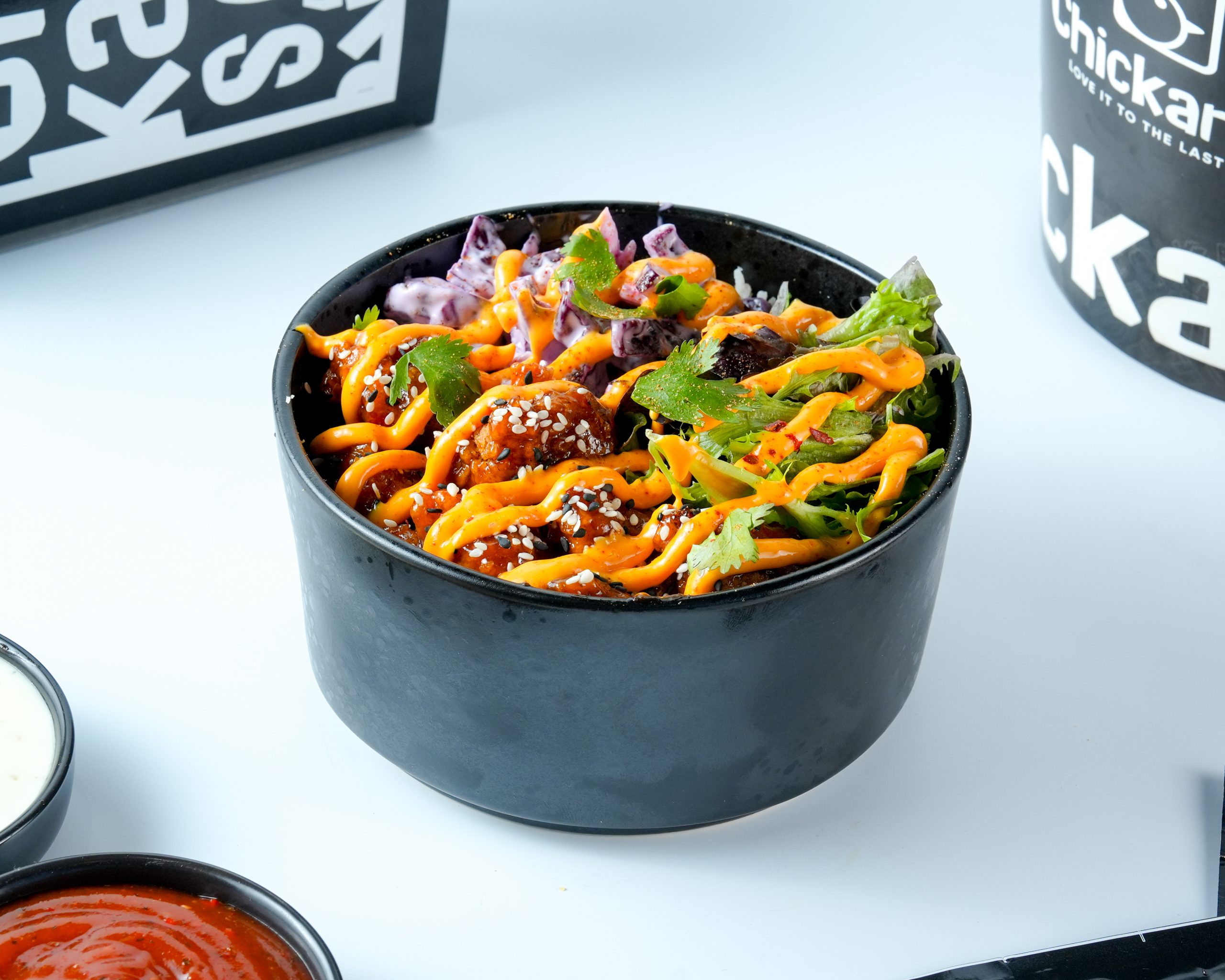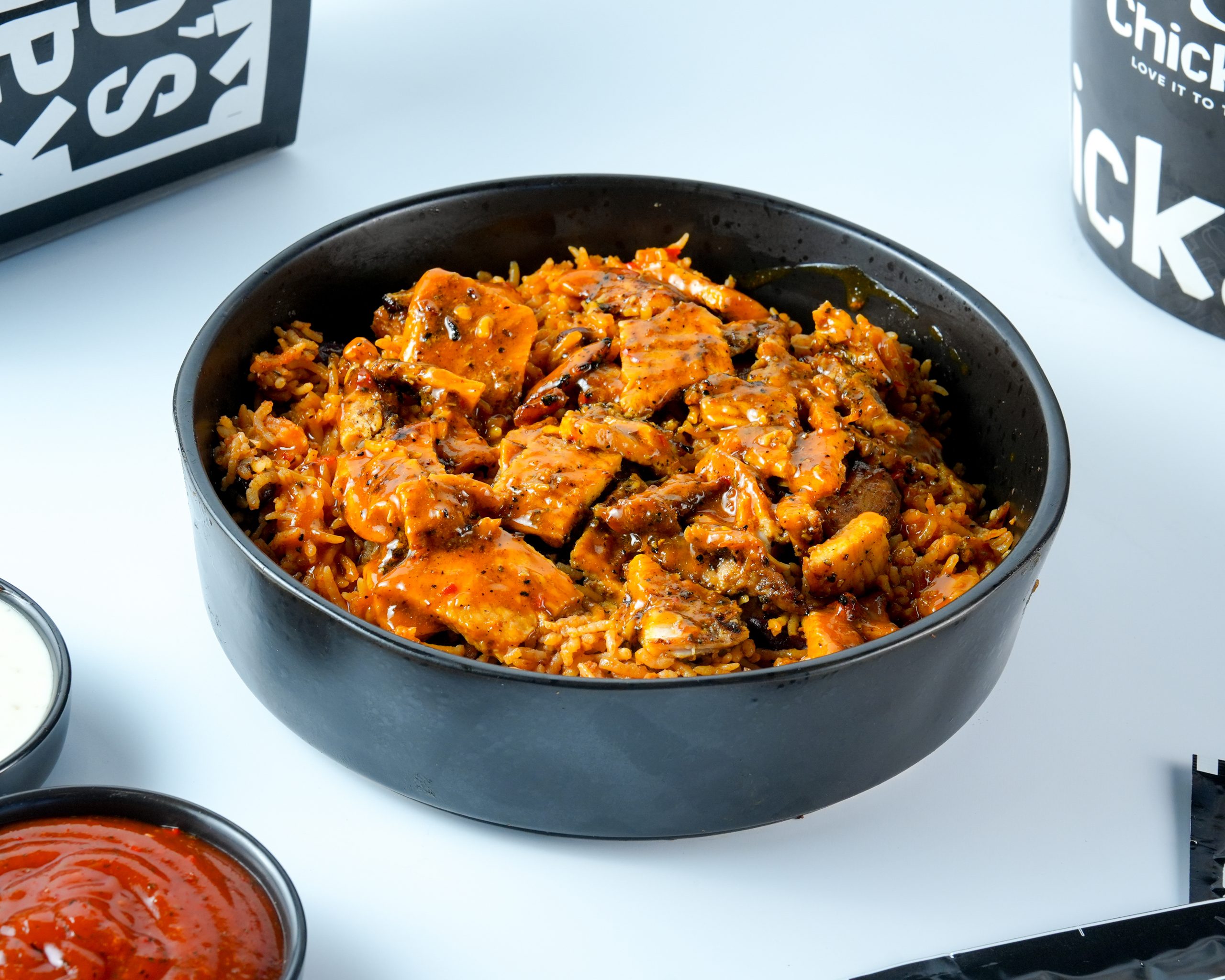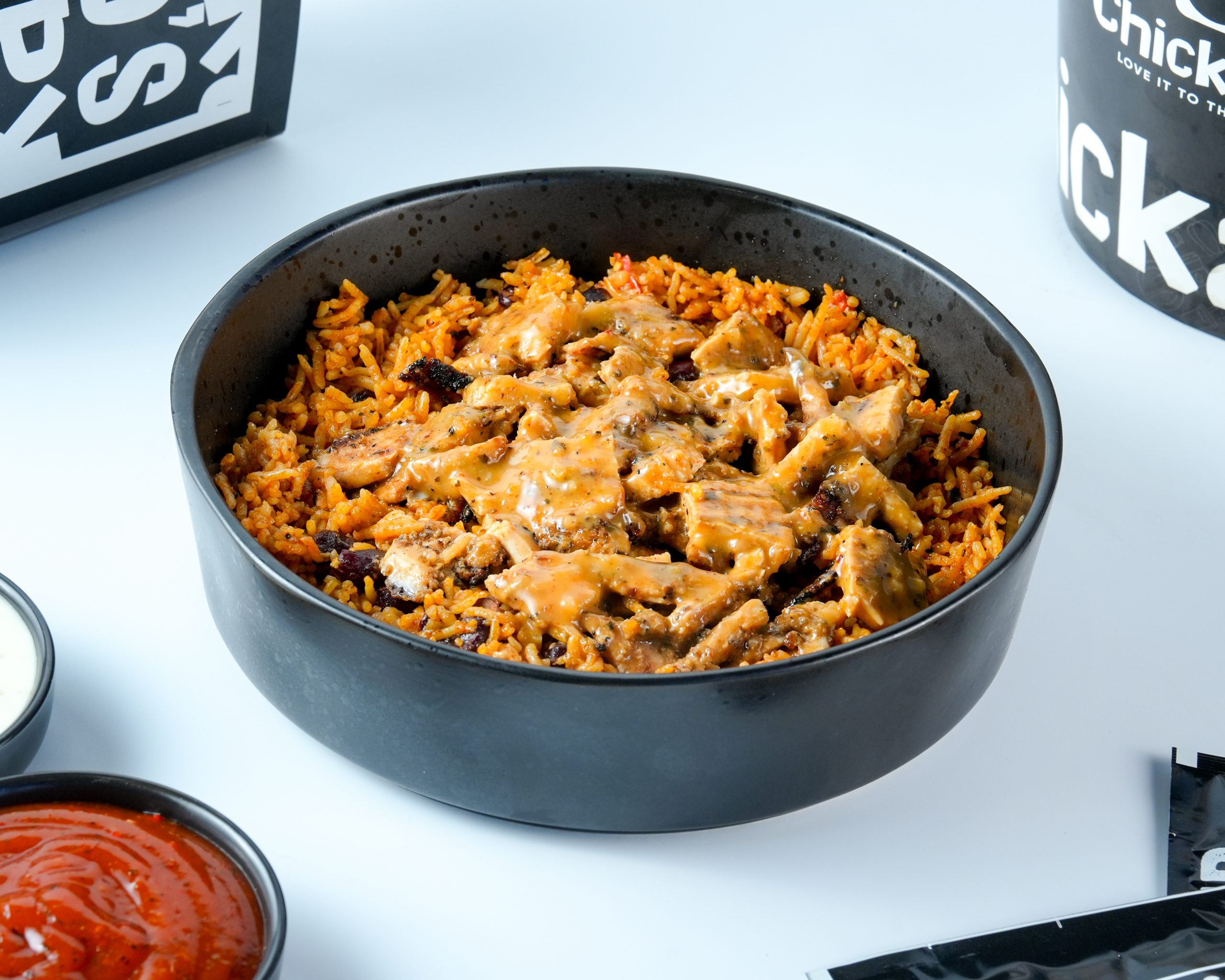 Aromatic Rice, Grilled Buffalo Chicken, Cheese, Spring Onions and Honey Mustard Dressing