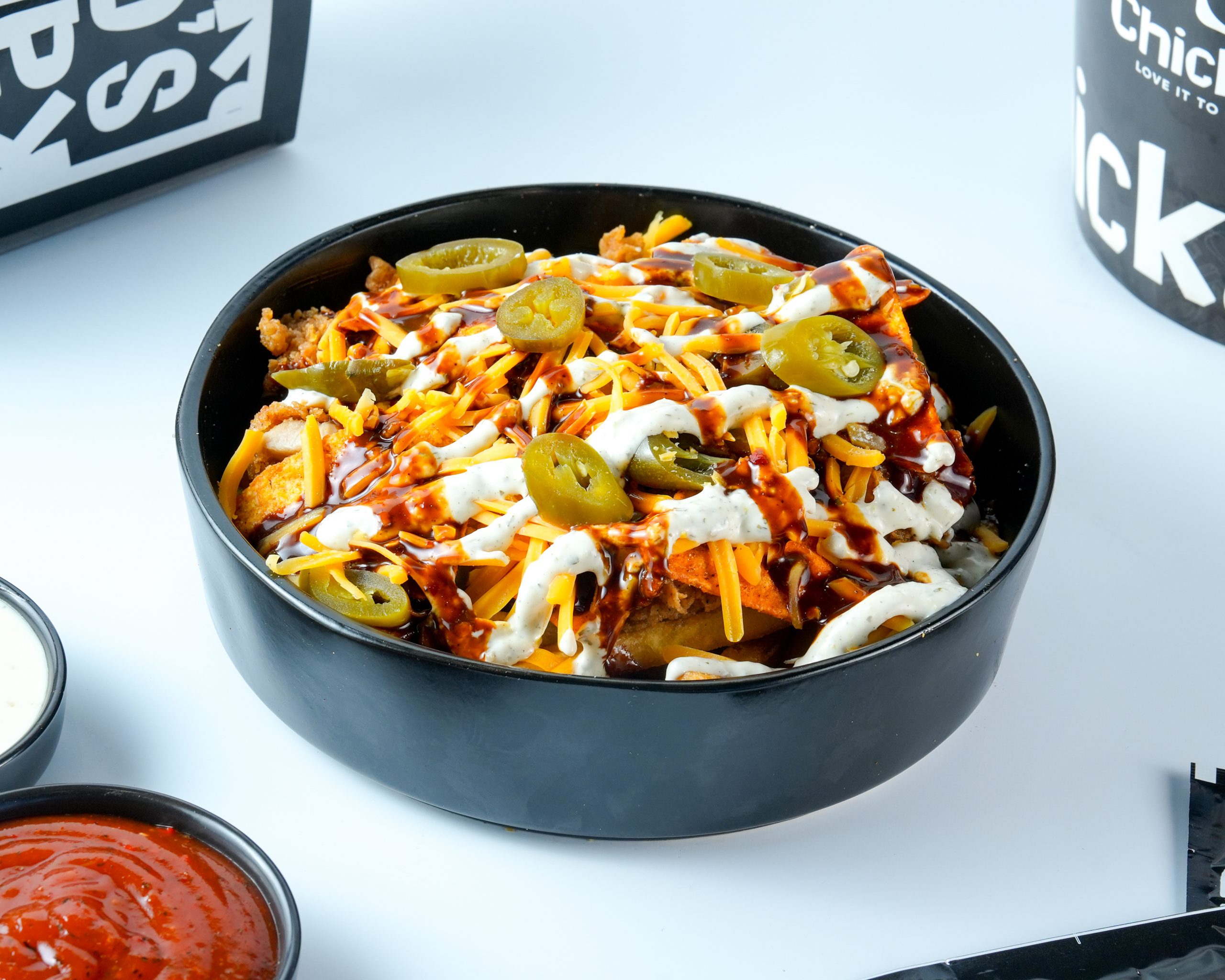 Skin on Chips, Fried Chicken, Nachos, JalapeƱos, Cheese, JalapeƱo Sauce and Buffalo Sauce