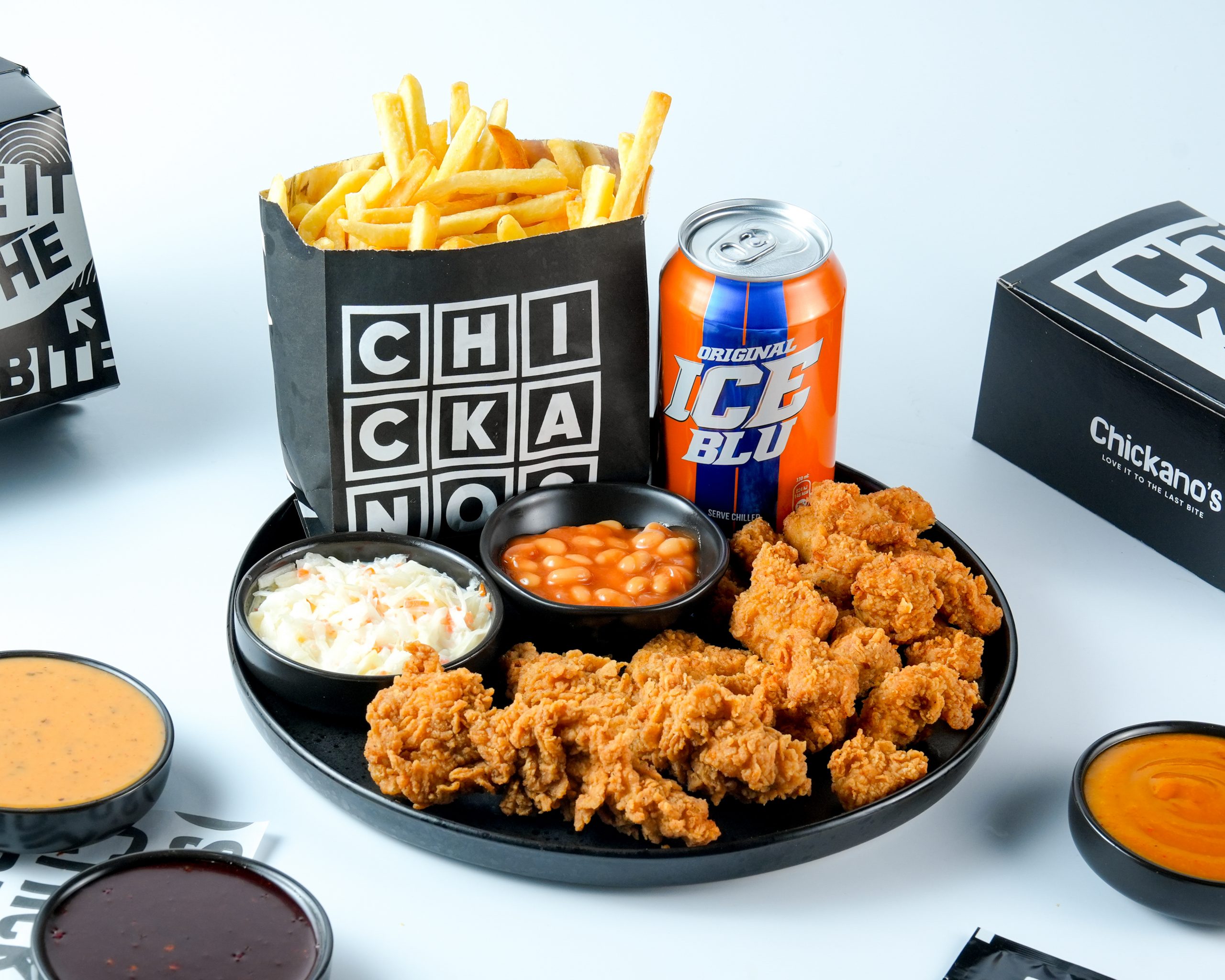 Our brand new Boneless Box! Containing a portion of our Buttermilk Fried Popcorn Chicken, two of our Fried Buttermilk Chicken Strips, a portion of Fries and a portion of Beans and Coleslaw each.