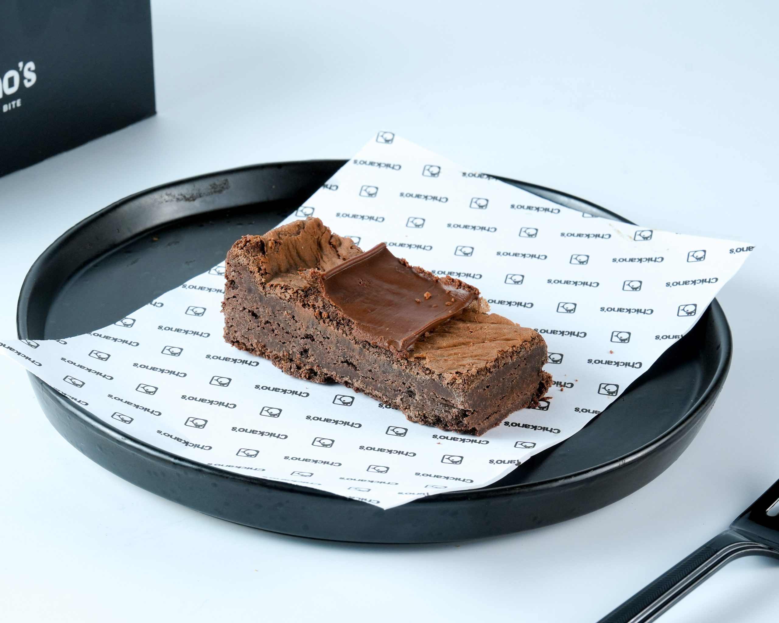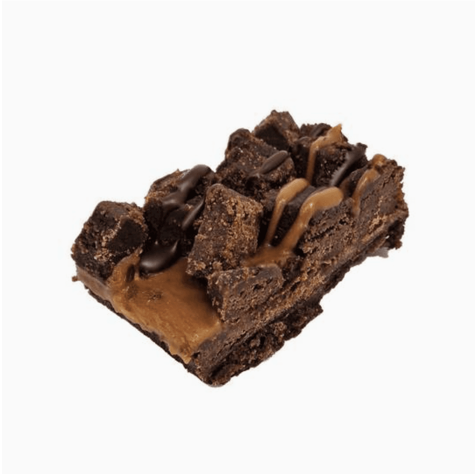 A dense brownie layered with salted caramel, topped with brownie cubes and ganache drizzle.